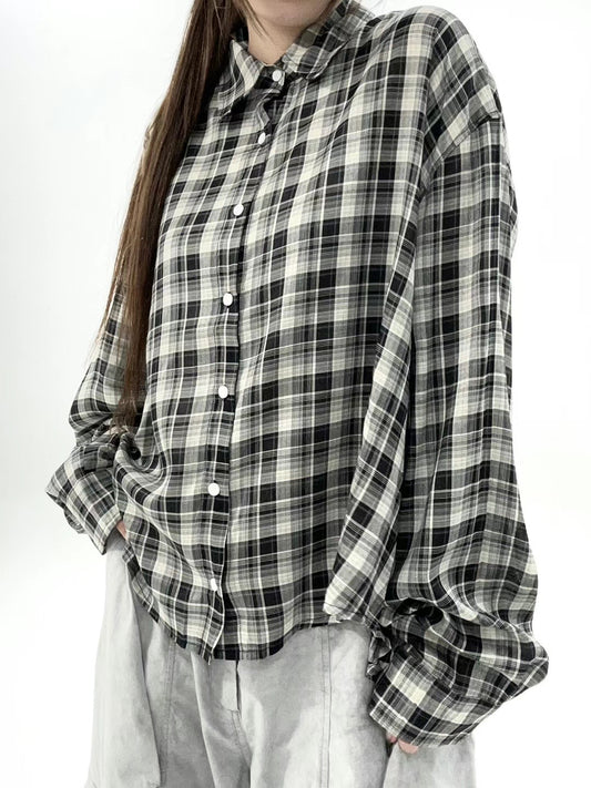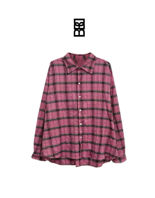 皺摺紋粉色系長袖格仔恤衫[ 2 COLOURS ]