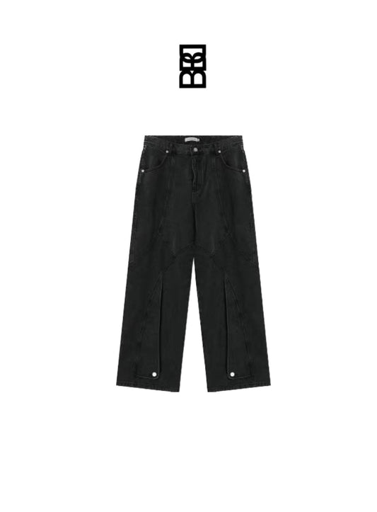 前後刀割黑色闊直腳半橡筋牛仔褲